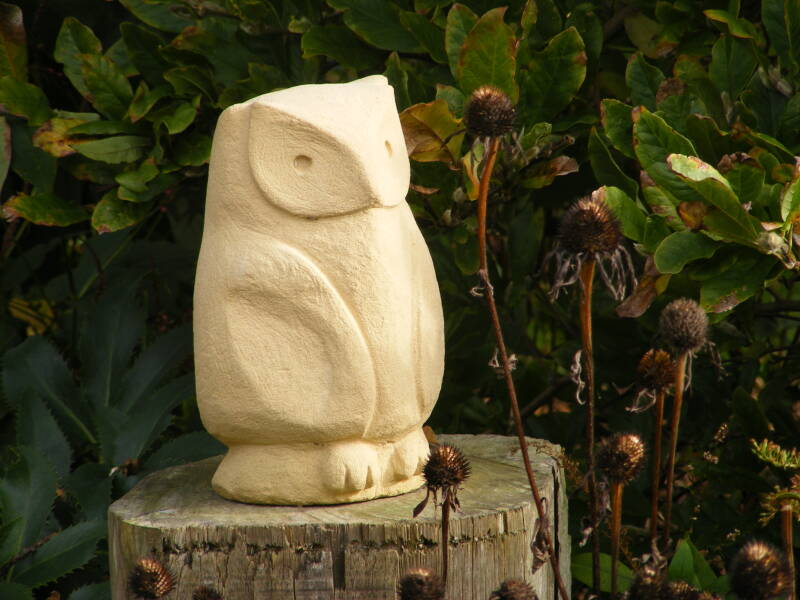 Slechts een keer heb ik met mergel gewerkt. Leuk om te doen. En ja hoor het werd weer een uil. Hier ziet het er nog mooi geel uit. Inmiddels is het beeldje in de buitenlucht wat groen geworden.