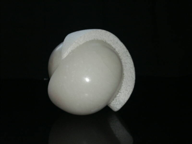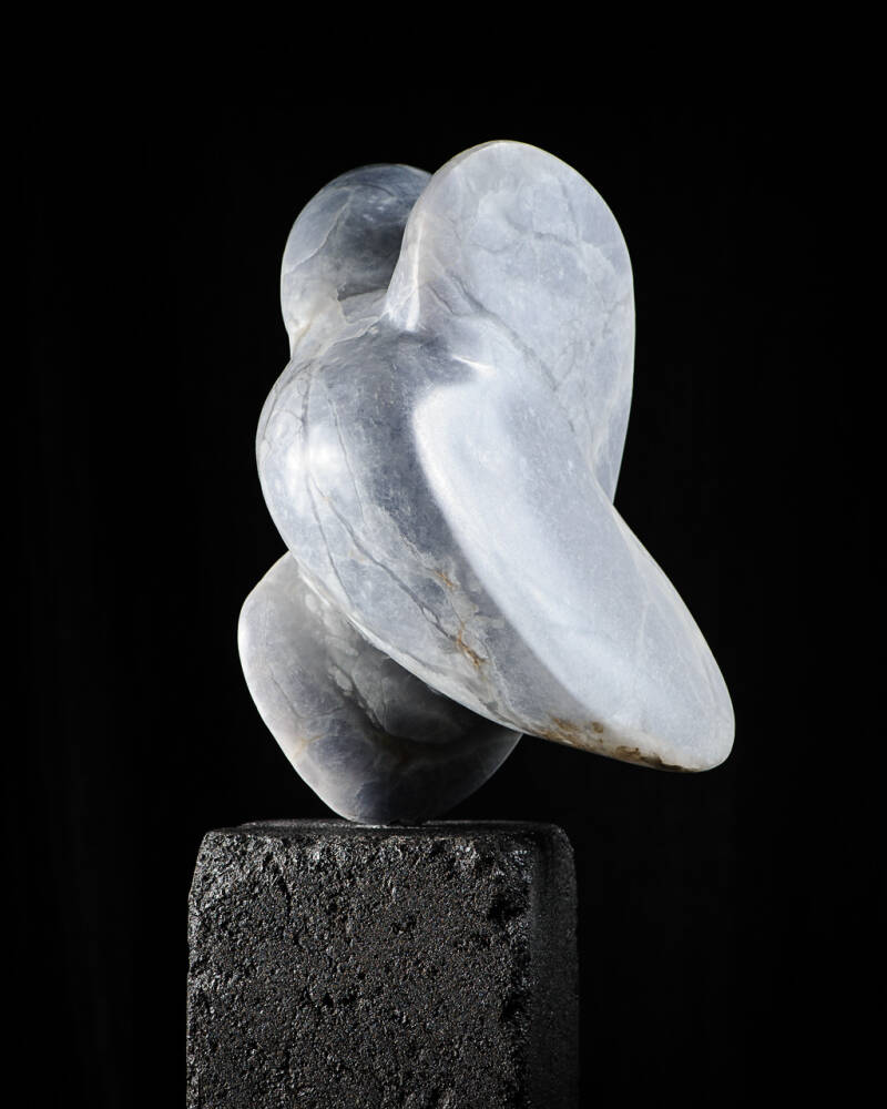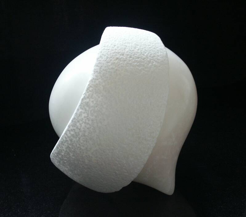 Het werken in albast is minder zwaar dan in serpentijn. Albast is goed te bewerken met een ronde beitel en door middel van vijlen. Onderstaande witte albast is nauwelijks geaderd en licht wit bewolkt. Ook deze steen is wat transparant. Dat is nauwelijks te zien in het uiteindelijke beeld bij het massieve gladde deel, maar wel door het ruwe deel dat de steen overlapt .