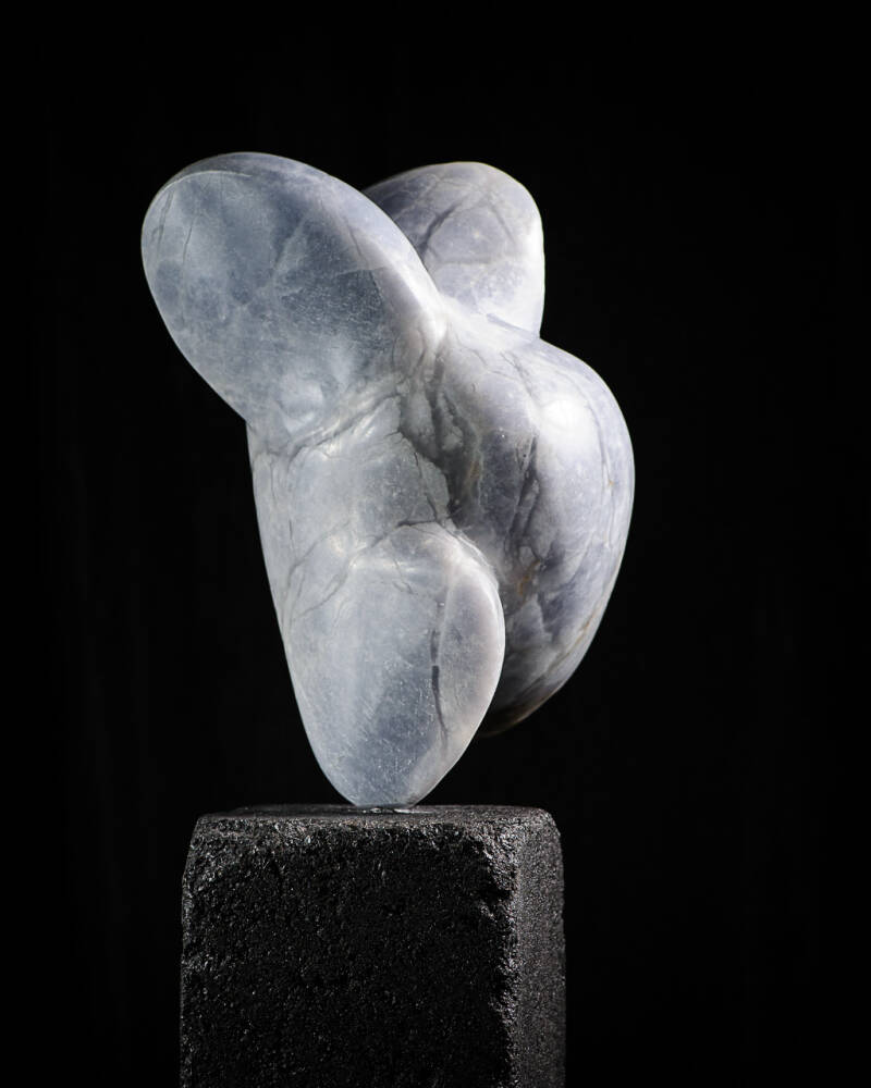 Onderstaand beeld is gemaakt van blauw/grijs geaderde albast. De donkerste delen van de steen laten het meeste licht door.