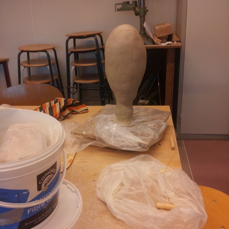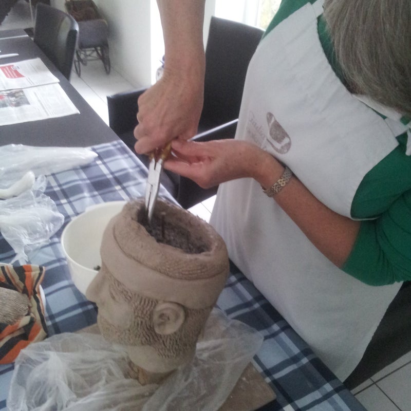De derde opdracht: maak een kop. Gestart werd met een lange pin op een plank. Daar omheen werden, heel strak, natte repen krantenpapier gedaan om een basis te hebben voor het maken van de kop. Hier omheen werd de klei aangebracht en werd de kop gevormd. Het is een fantasie kop geworden. Toen de klei stevig genoeg was is de kop open gesneden en heb ik de kranten met een grove tang verwijderd. Een pittige klus. Daarna moest de kop weer gesloten worden met klei-pap om de opening weer dicht en onzichtbaar te maken.