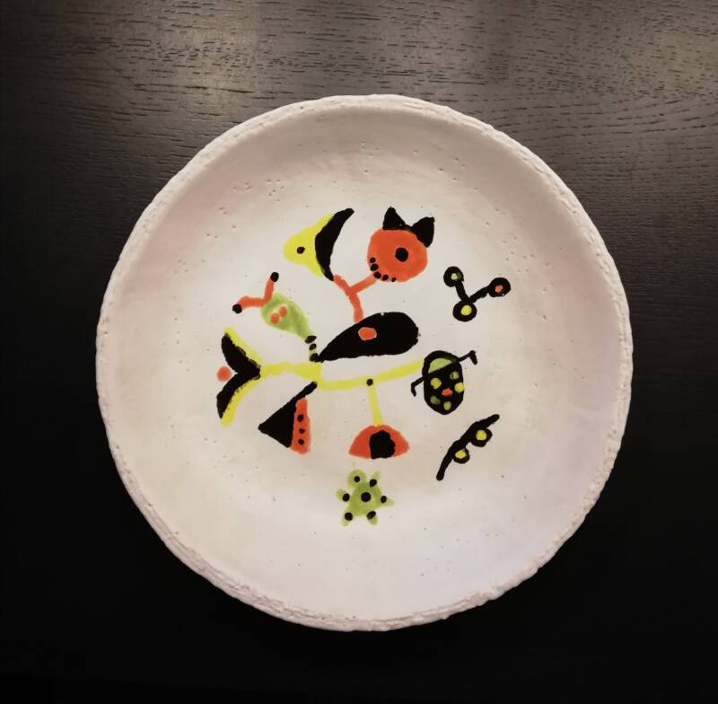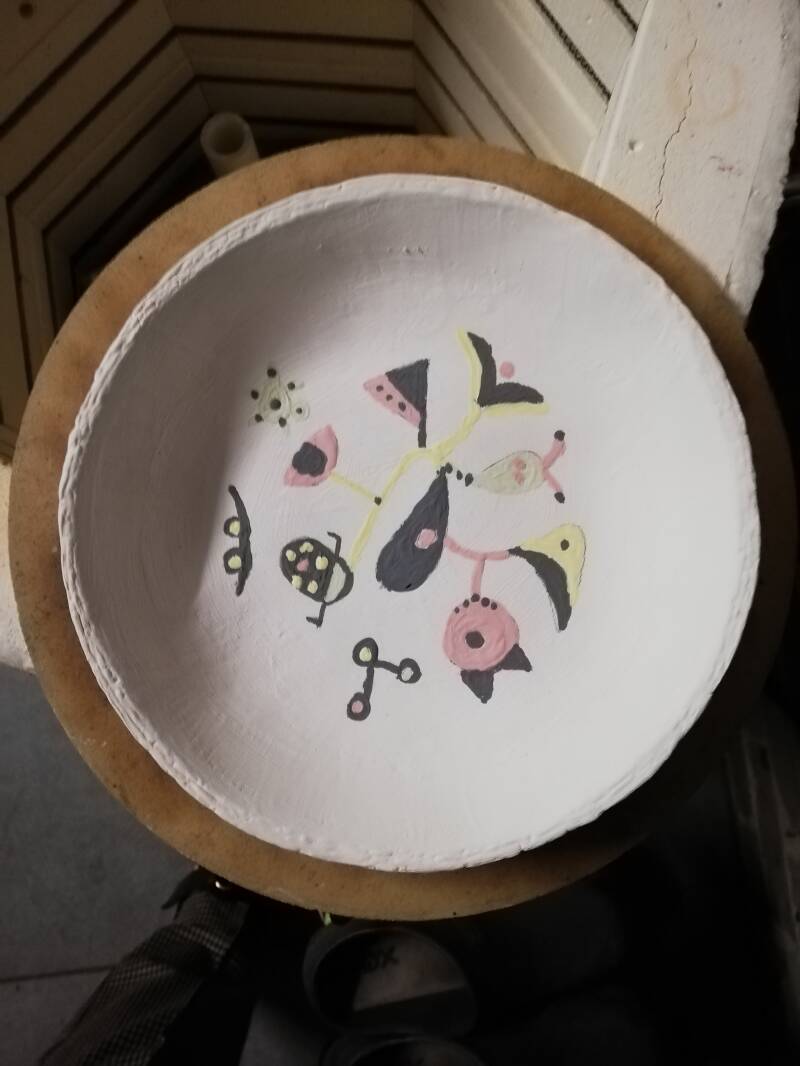 Weer eens wat nieuws geprobeerd. Majolica techniek. Dat is het aanbrengen van onderglazuur op bijvoorbeeld een biscuit gebakken schaal en daarop met unidekor iets schilderen. Hahaha nee het lijkt niet op Miro, die werkte veel strakker. Maar zo leuk om uit te proberen.